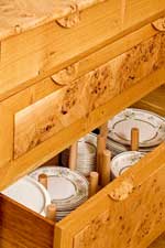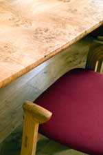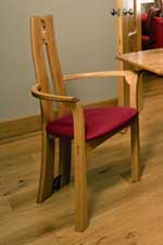 The sculptured oak side chairs with burr oak detail in their backs have been made according to our body-conscious design, including hand grips to enable the user to get up easily and arm rails on the scuptured carver chairs,