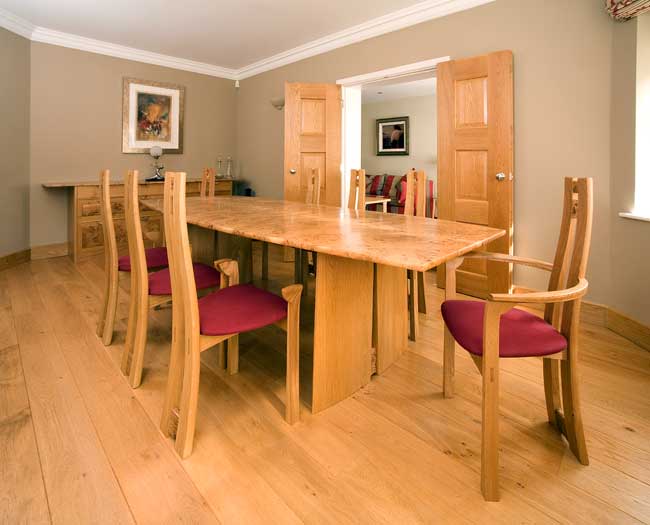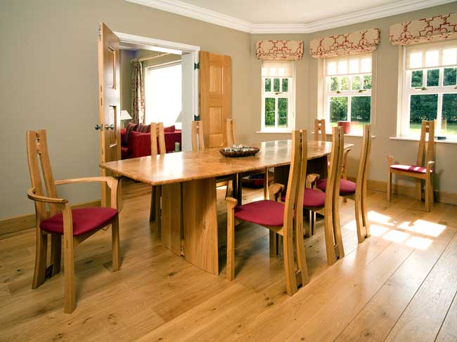 This 275cm-long dining table has a solid English burr oak top and oak base and can seat twelve comfortably.