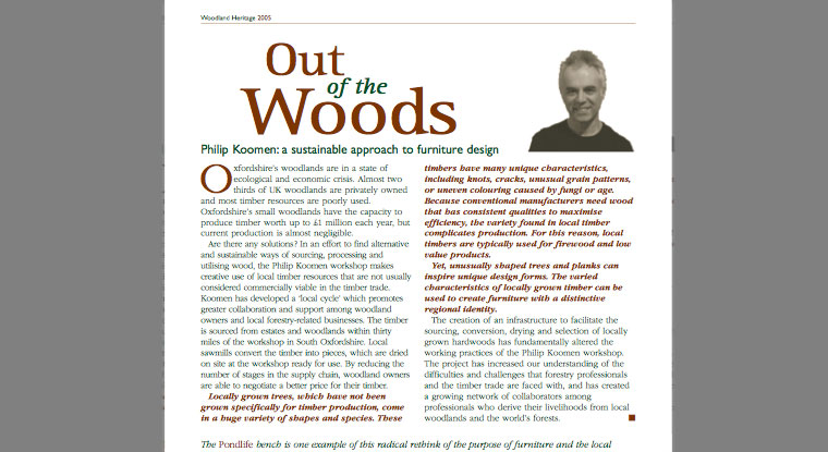 Out of the Woods ~ Philip Koomen: a Sustainable Approach to Furniture Design The Exhibition Catalogue, 2004 provides a commentary by Philip on his approach to utilising undermanaged local woodland resources. Download PDF ... Next